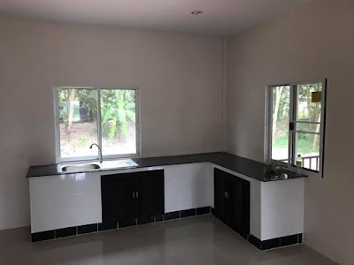 สำหรับห้องครัว ยังคงไว้ด้วยการตกแต่งโทนสีขาวเรียบง่าย ประกอบเข้ากับเคาน์เตอร์ครัวบิวท์อินรูปตัวแอล กรุแต่งด้วยกระเบื้องสีขาวปูท็อปดำดูสะอาดตาน่าใช้งาน